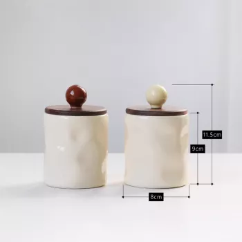 Vintage Ceramic Cotton Swab Storage Box with Walnut Lid